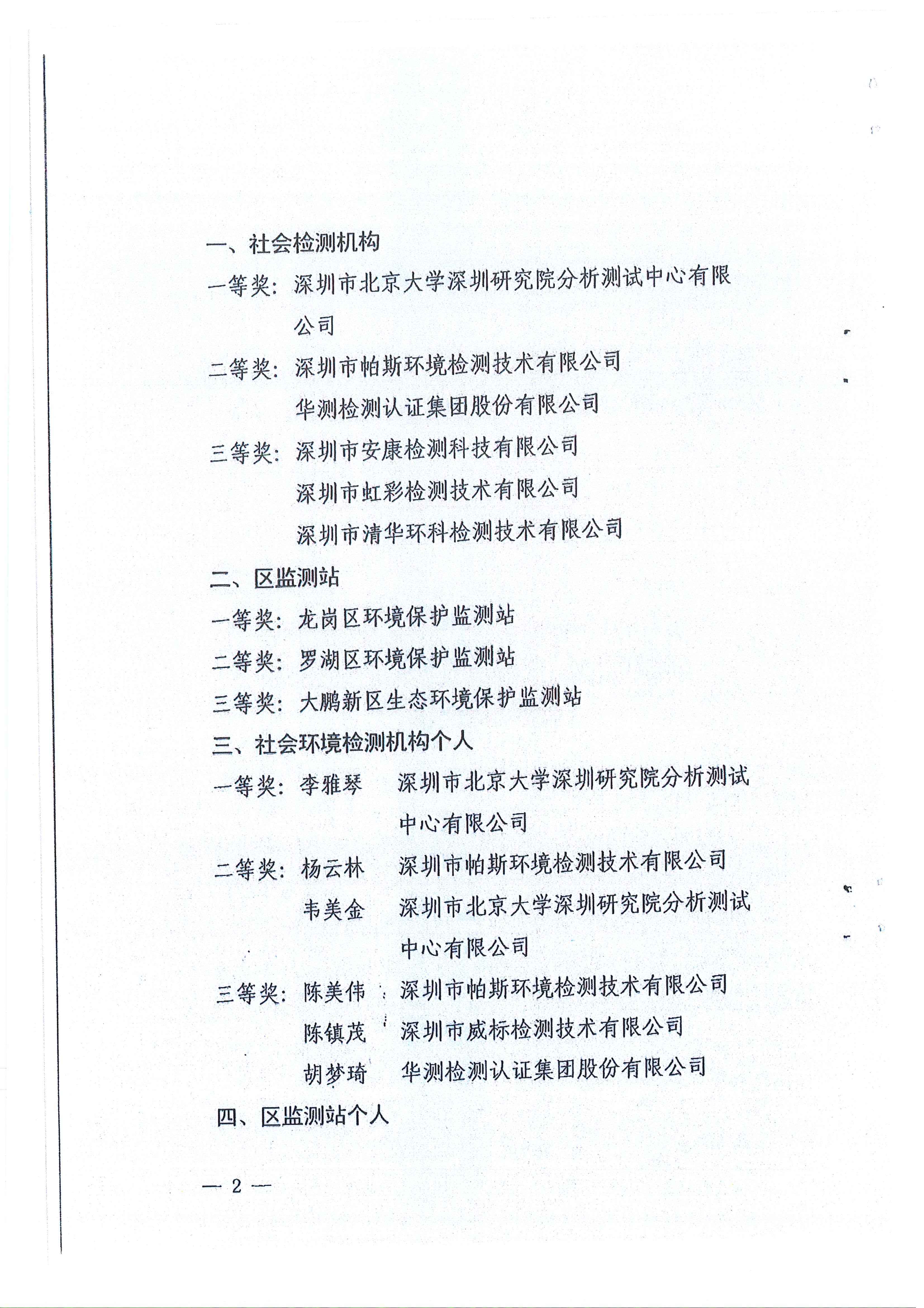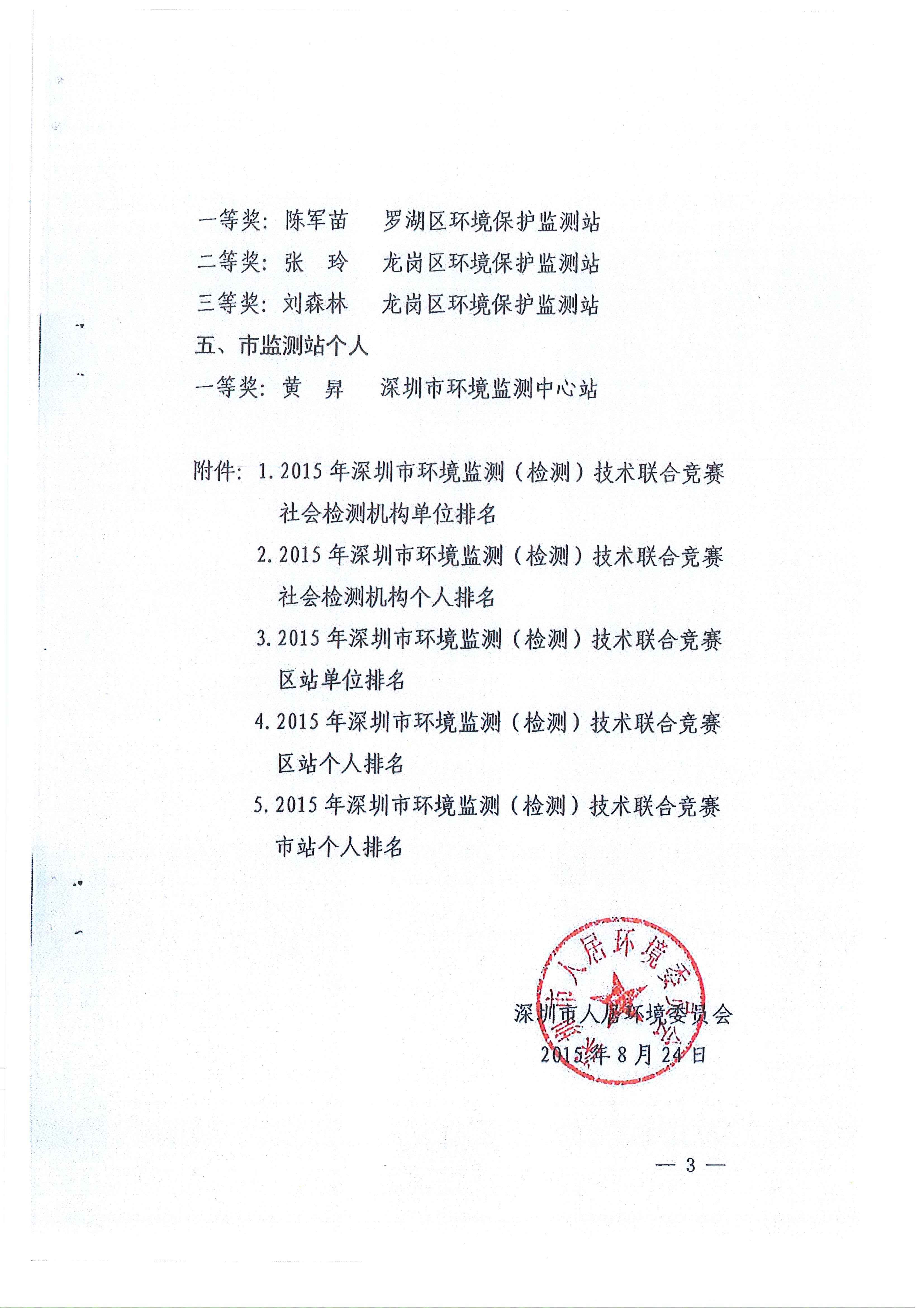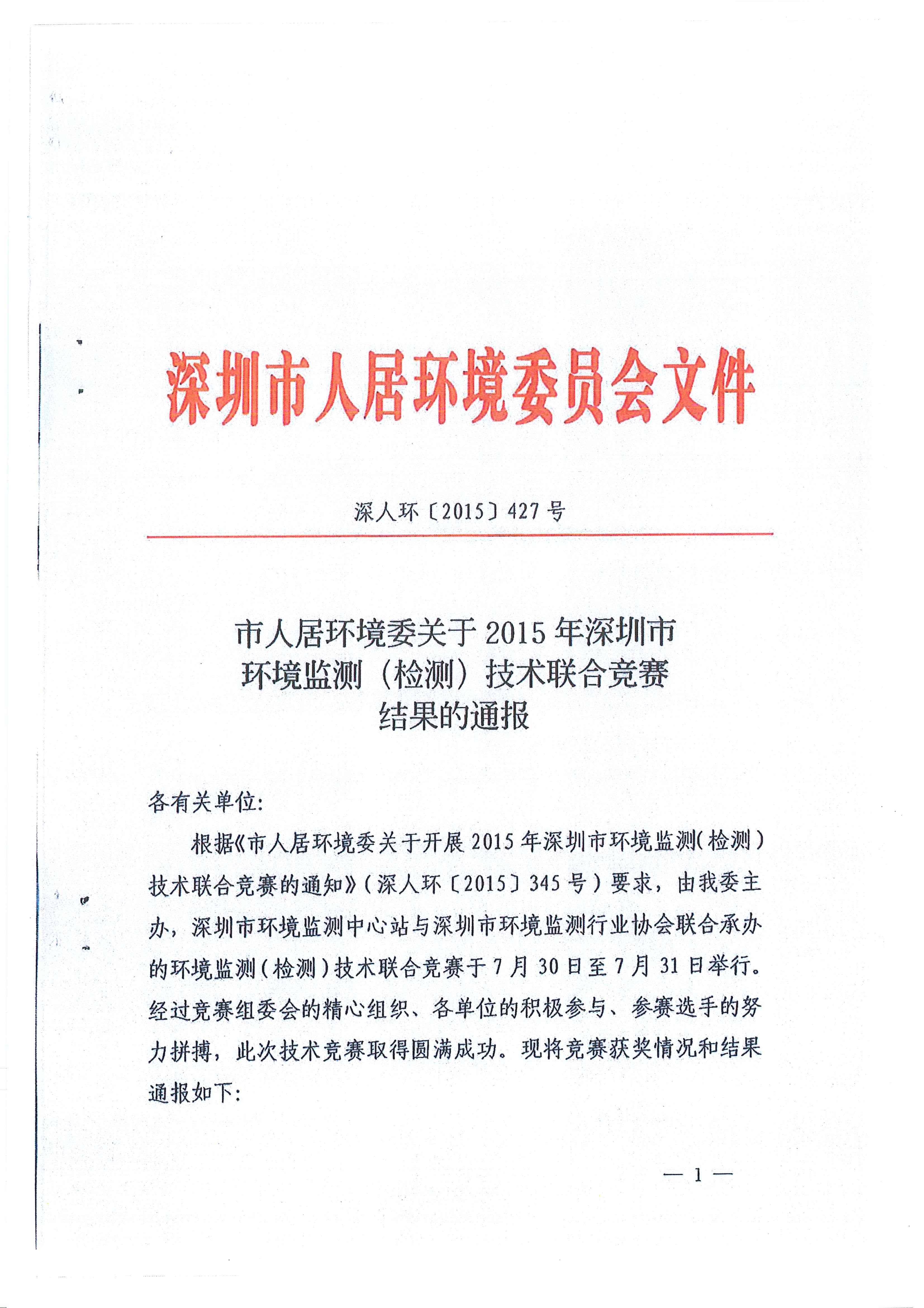 市人居环境委关于2015年深圳市环境监测(检测)技术联合竞赛结果的通报