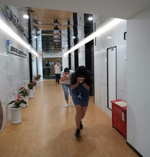 下午15时,随着“应急警报”铃声的响起,演练正式开始。物业义务消防员发现火情,迅速赶到现场,第一时间按响警报铃,同时通过消防应急广播向全体员工下达立即撤离指示。接到指令后,全体员工都能按要求弯腰,用毛巾或手捂着鼻子,跟着队伍迅速撤离到安全的位置。整个过程行动快速,配合默契,没有出现混乱的场面。